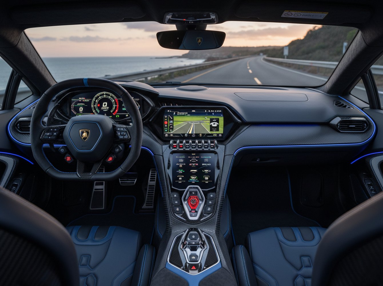 Despite its extreme focus, the Centenario’s cockpit is surprisingly refined. A fully digital instrument panel provides crucial telemetry, while a portrait-oriented central touchscreen manages infotainment and vehicle settings with intuitive clarity. Lamborghini’s Ad Personam customization program allows buyers to tailor every surface, ensuring each of the limited-production vehicles is truly unique. The driver-centric layout places all critical functions on the steering wheel, minimizing distraction at speed.