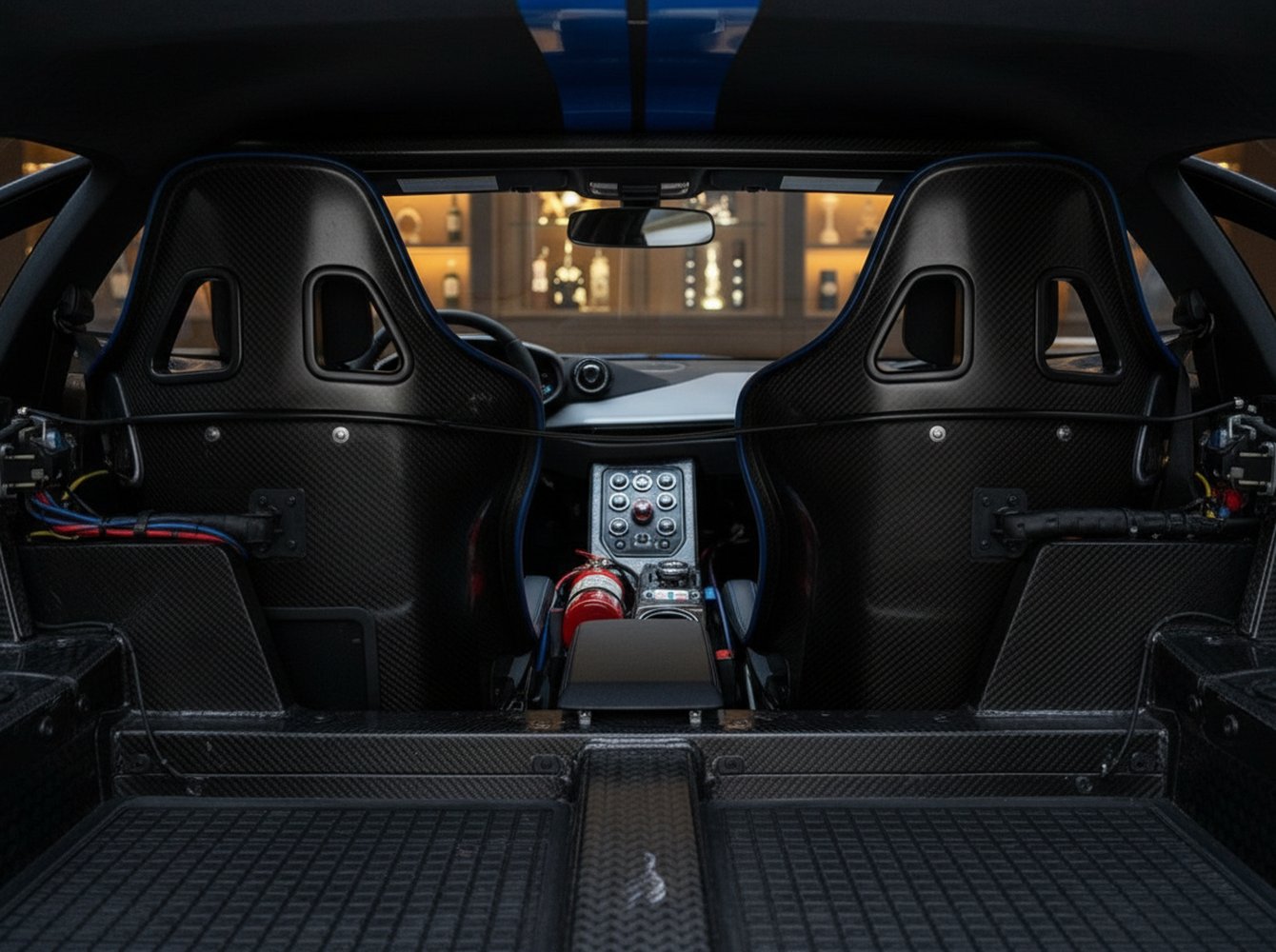 Inside, the concept of luxury is replaced by pure, driver-focused ergonomics. The cockpit is a purposeful space, featuring FIA-compliant racing seats and a full roll cage. There is no infotainment screen; instead, a MoTeC data acquisition system provides the driver with every critical vehicle metric. The yoke-style steering wheel places all essential controls at the driver’s fingertips, ensuring total focus remains on the track ahead. Utility here is measured in accessibility to data and vehicle setup, not cargo space.