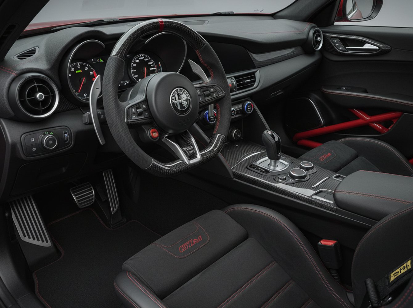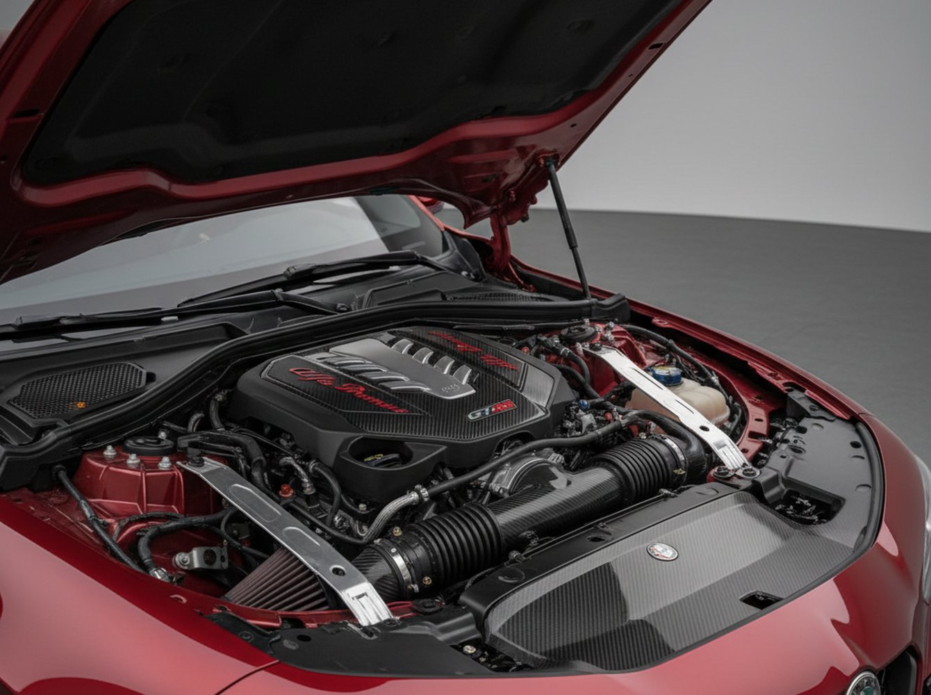 At the heart of this machine lies an evolution of Alfa Romeo’s celebrated 2.9-liter twin-turbocharged V6. Now recalibrated to produce an astonishing 620 horsepower, it sends power exclusively to the rear wheels through a lightning-fast 8-speed automatic transmission. The chassis has been comprehensively reworked with a 50mm wider track, bespoke springs, and electronically controlled dampers tuned for Nürburgring-level performance. Anchoring this power are standard Brembo carbon-ceramic brakes, housed within 20-inch center-lock wheels.
