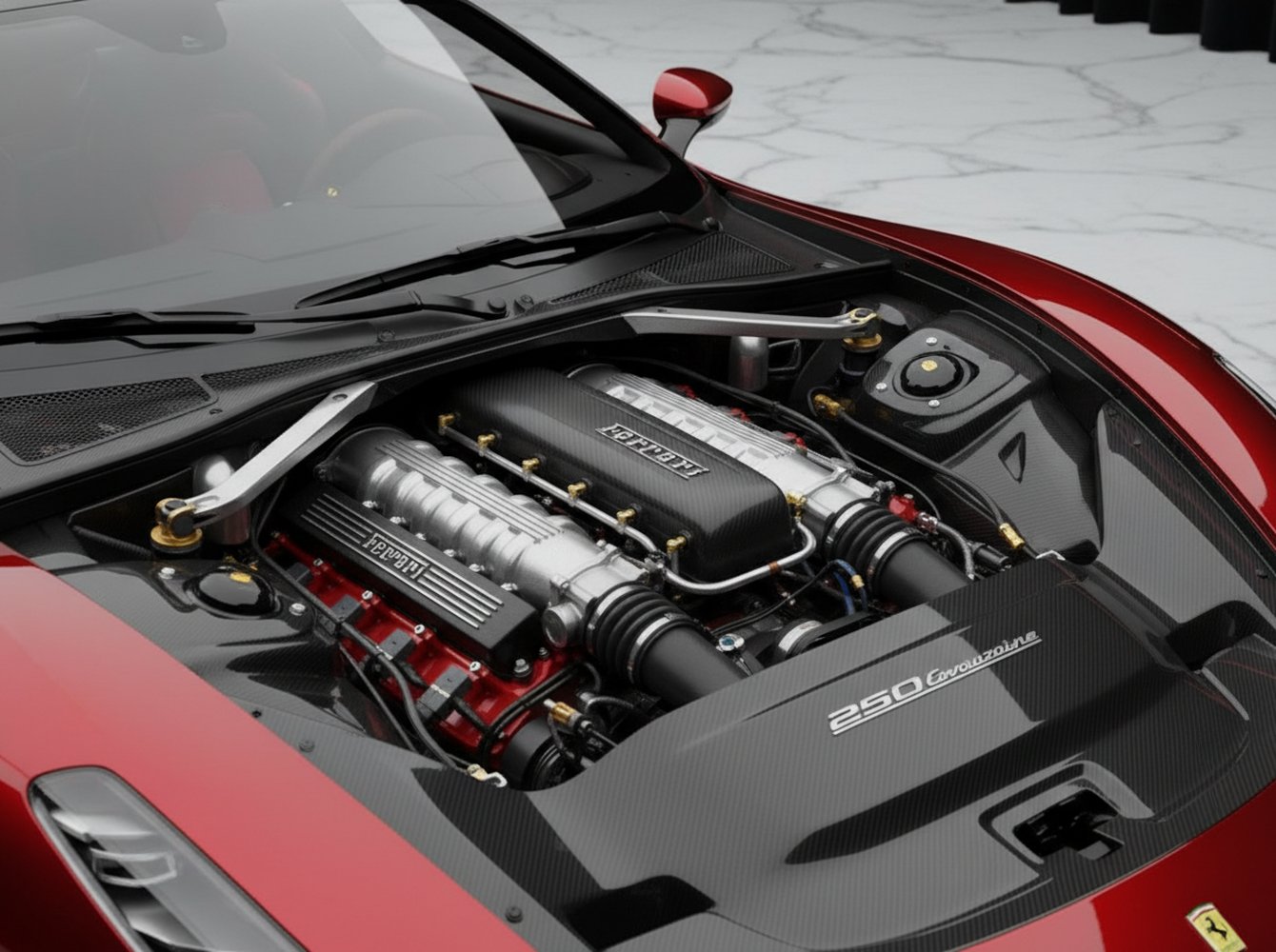 At the heart of the 250 Evoluzione is a powertrain that honors its V12 lineage. It features a naturally-aspirated 6.5-liter V12, screaming to a 9,500 RPM redline, paired with a Formula 1-derived KERS-style hybrid system. The combined output is a staggering 1,020 horsepower and 680 lb-ft of torque, delivered through a lightning-fast 8-speed dual-clutch transaxle. The focus isn’t just power, but throttle response that feels telepathic.