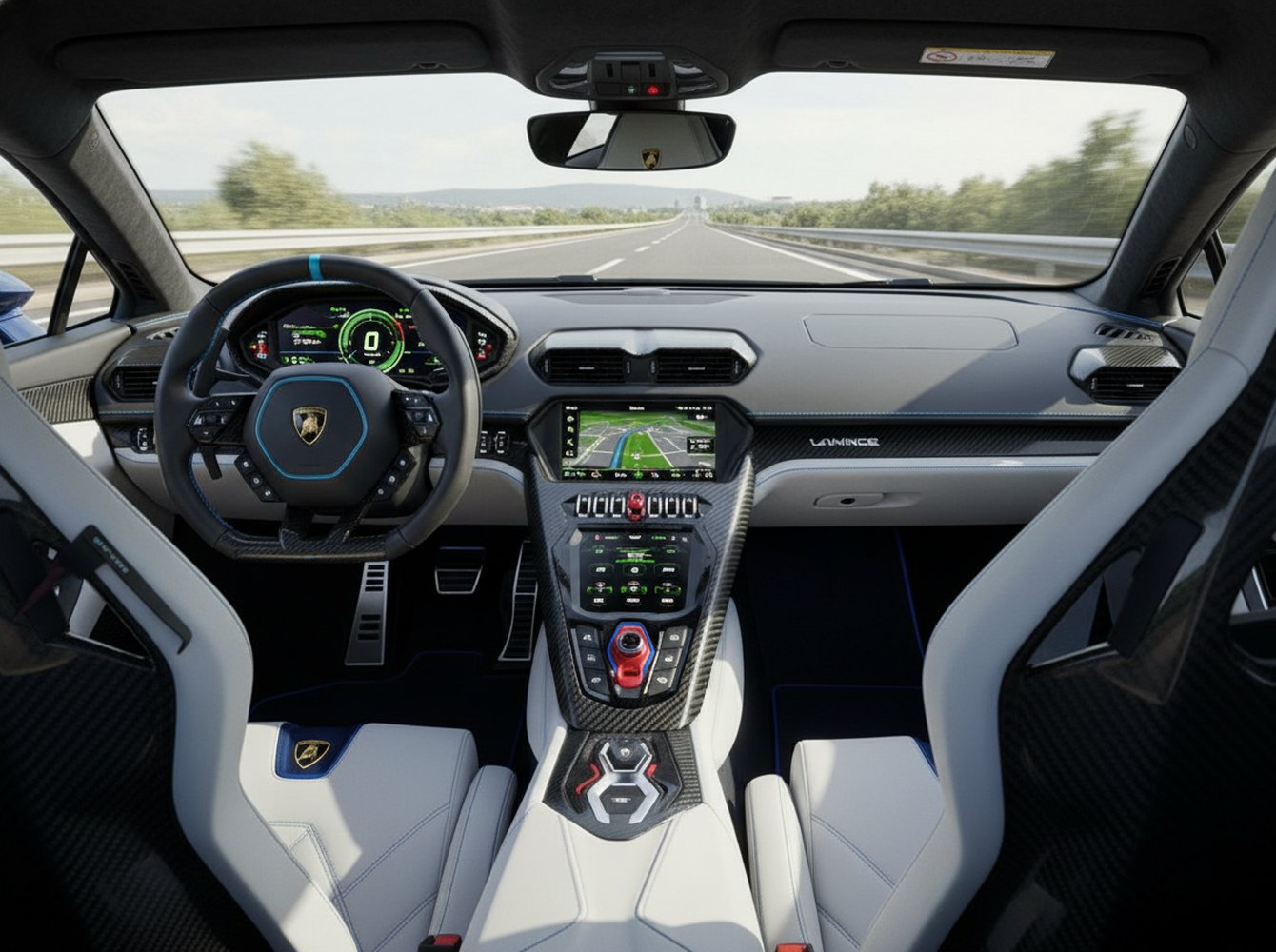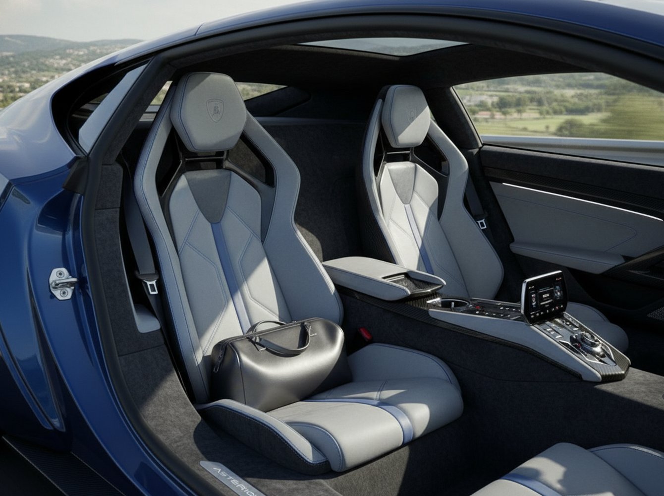 Inside, the Asterion presents the most spacious and luxurious cabin in the modern Lamborghini lineup. The interior is a symphony of sustainable leathers, Alcantara, and forged carbon composites, designed with driver comfort as a priority. A new portrait-oriented central touchscreen provides intuitive control over infotainment and vehicle dynamics, while enhanced sound insulation and ergonomic seating make it a genuinely usable grand tourer.