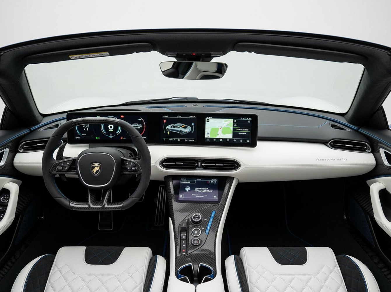 The Anniversario’s aesthetic is a masterclass in automotive artistry, a rolling sculpture that honors its heritage while looking decisively to the future. Each of the five cars features a unique, handcrafted livery combining three signature colors: Bianco Sestriere, Grigio Antonelliano, and the brand’s iconic Iconica Blu. The required ‘Furiosa’ aerodynamic package is standard, rendered in a striking dual-tone exposed carbon fiber, enhancing both its visual aggression and aerodynamic efficiency. Forged aluminum center-lock wheels and exclusive ‘Anniversario’ badging complete the exterior’s bespoke statement.