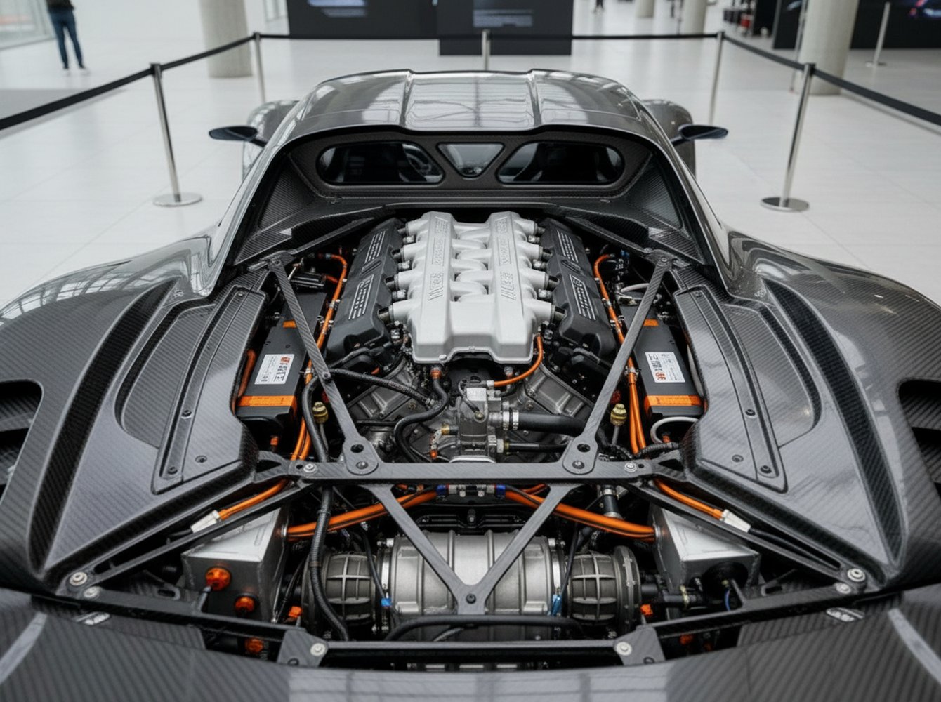 At the heart of the V Max lies the same potent hybrid powertrain: a bespoke 2.88-liter, flat-plane crank twin-turbo V8 paired with two high-output electric motors, delivering a staggering 1,250 horsepower. The powertrain and seven-speed sequential transaxle have been meticulously retuned, with revised gear ratios optimized for a stratospheric top end. The suspension is also recalibrated for maximum stability, ensuring the V Max remains composed as it approaches its theoretical V-max of over 280 mph.